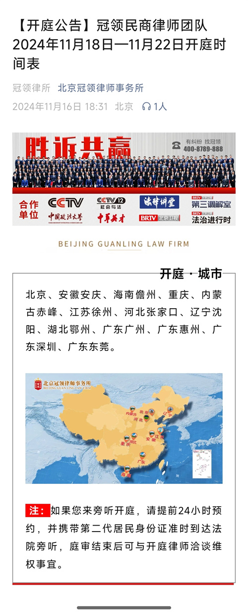 民商律师团队11月18日-11月22日开庭时间表,开庭城市涉及:新疆喀什、安徽黄山、北京、安徽安庆、海南儋州、重庆、内蒙古赤峰、江苏徐州、河北张家口、辽宁沈阳、湖北鄂州、广东广州、广东惠州、广东深圳、广东东莞。